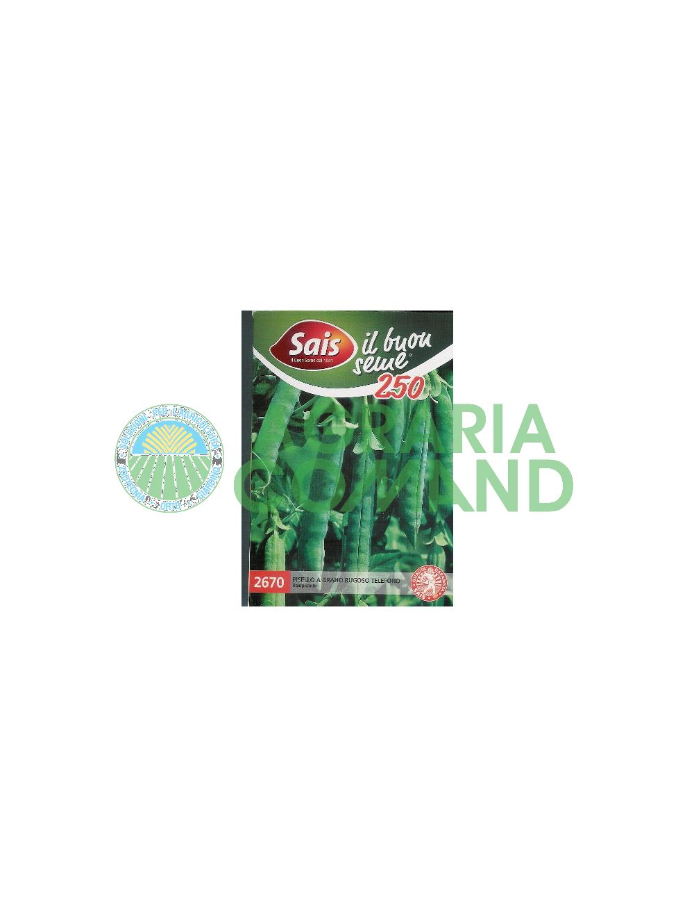 Petit à moyen pois de semence, rond irrégulier, surface ridée, vert moyen. Plante grimpante, 100/110 cm de haut. Feuilles tachetées vert moyen.